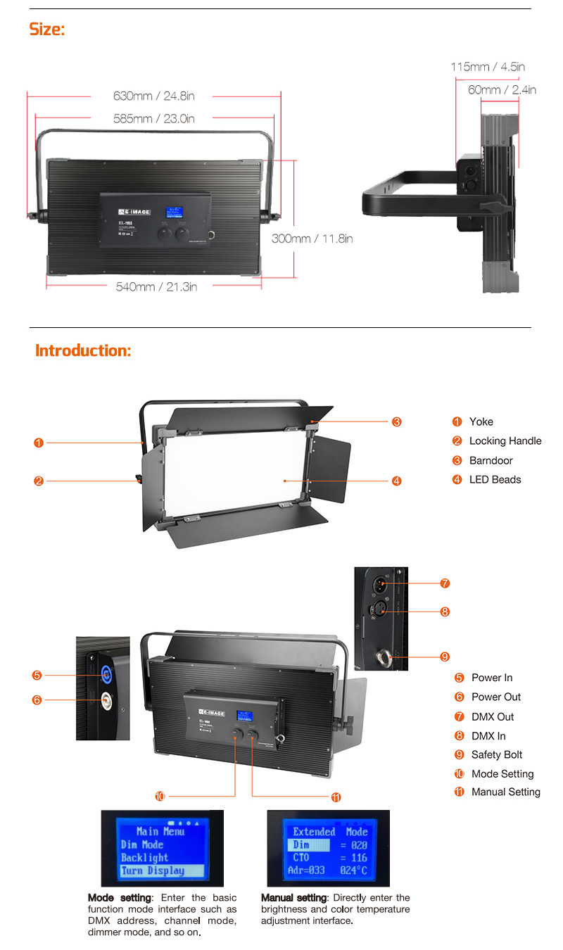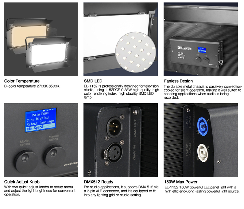 E-IMAGE Nuevo panel de luz LED EL-1152 equipado con perlas de lámpara de 1152PCS, CRI>95 completamente con 2700k-6500k color perfecto para garantizar que su luz sea natural como la vida. La intensidad de la luz es variable de 0 a 100% para adaptarse al nivel ambiental o servir como una luz clave ajustable. Puede cambiar el brillo y la temperatura del color rápidamente usando la perilla de ajuste.